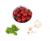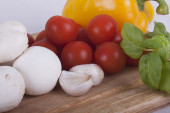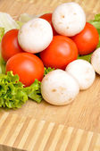 mozzarella, pomidory, czosnek i sałatka z liści i bazylia na desce