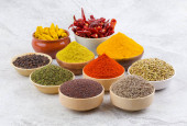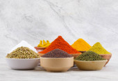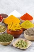 Zdjęcie "Kolekcja indyjskich przypraw zwany również Red Chili w proszku, kurkuma w proszku, kolendra w proszku, kij kurkuma, suche chili, kozieradka, czarny pieprz, kminek, ziarno gorczycy, Mirchi, Haldi na Vintage tle" może być wykorzystywane do celów osobistych i komercyjnych zgodnie z warunkami zakupionej licencji Royalty-free. Obraz jest dostępny do pobrania w jakości wysokiej rozdzielczości do 5760x3840.