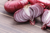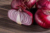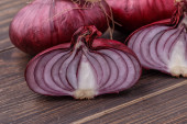 zbliżenie widok połówki czerwonej cebuli na drewnianym stole