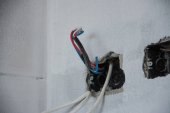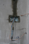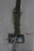 instalacja elektryczna na ścianie na placu budowy, wylot z rurami żelaza
