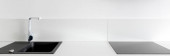 Minimalistyczna i stylowa kuchnia z białym blatem, szafkami i szufladami oraz czarnym zlewem, okapem kuchennym i płytą indukcyjną