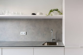 Zdjęcie "Minimalistyczna i stylowa kuchnia z białym blatem, szafkami i szufladami oraz czarnym zlewem, okapem kuchennym i płytą indukcyjną" może być wykorzystywane do celów osobistych i komercyjnych zgodnie z warunkami zakupionej licencji Royalty-free. Obraz jest dostępny do pobrania w jakości wysokiej rozdzielczości do 5760x3840.