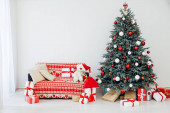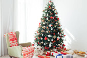 Choinka z czerwonymi prezentami wystrój girlanda na nowy rok zima w białym pokoju karty wakacje
