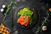 Jedzenie. Zestaw belgijskich gofrów na śniadanie. Na czarnym kamiennym tle. Widok góry. Wolne miejsce na tekst.