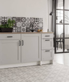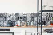 Modne białe wnętrze kuchni z eleganckimi drewnianymi szafkami i akcesoriami kuchennymi