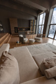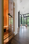 Zdjęcie "Panorama eleganckiego salonu z widokiem na ścianę i ogród, z drewnianą podłogą i ścianą oraz dużą, wygodną sofą narożną" może być wykorzystywane do celów osobistych i komercyjnych zgodnie z warunkami zakupionej licencji Royalty-free. Obraz jest dostępny do pobrania w jakości wysokiej rozdzielczości do 5760x3840.