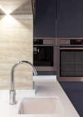 Zdjęcie "Panorama eleganckiej kuchni z lustrzaną ścianą i zbliżeniem na płycie indukcyjnej z pięcioma palnikami" może być wykorzystywane do celów osobistych i komercyjnych zgodnie z warunkami zakupionej licencji Royalty-free. Obraz jest dostępny do pobrania w jakości wysokiej rozdzielczości do 5760x3840.