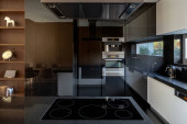 Panorama eleganckiej kuchni z lustrzaną ścianą i zbliżeniem na płycie indukcyjnej z pięcioma palnikami