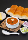 Pav Bhaji jest indyjskim tradycyjnym popularnym Street Fast Food. Grube i pikantne curry warzywne serwowane z miękkim bułki / bułka Paav i masło