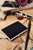 Puste stare zdjęcia w albumie i suszone kwiaty, na kolorowe drewniane tło