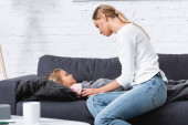 Selektywne skupienie kobiety dotykającej czoła córki na sofie