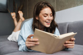 Zdjęcie "Obraz młodej szczęśliwej pozytywnej dziewczyny siedzącej w domu na kanapie podczas czytania książki" może być wykorzystywane do celów osobistych i komercyjnych zgodnie z warunkami zakupionej licencji Royalty-free. Obraz jest dostępny do pobrania w jakości wysokiej rozdzielczości do 5760x3840.