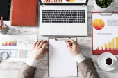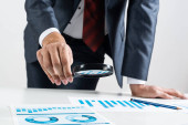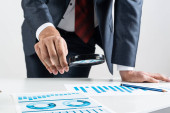 Człowiek analizujący dokumenty finansowe szkłem powiększającym. Ekspertyza finansowa i doradztwo. Menedżer w garniturze pracuje z analityką biznesową. Koncepcja podwójnej ekspozycji na przedsiębiorczość i kierownictwo