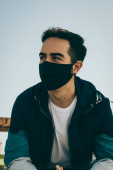 Portret młodego mężczyzny w masce pracującego w domu. Piosenkarz i producent muzyczny. Niesamowite miejsce pracy. Praca w edycji wideo i muzyki.