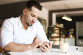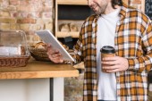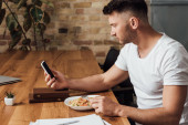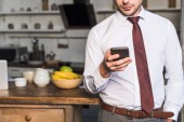brodaty, wytatuowany wolny strzelec mieszający śniadanie podczas rozmowy przez telefon komórkowy w kuchni