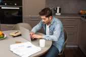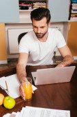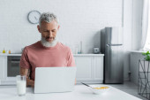 młody wytatuowany wolny strzelec przy użyciu laptopa w pobliżu miski, pomarańczy i butelki mleka w kuchni