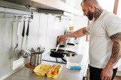 młody człowiek w białej koszulce i dżinsy holing bowl ze śniadaniem stojąc w kuchni