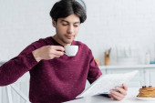 selektywne skupienie się na wytatuowanym mężczyźnie w białej koszulce czytającym gazetę trzymając dzbanek do kawy w kuchni