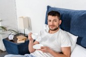 młody wytatuowany mężczyzna czytający wiadomości ekonomiczne podczas śniadania w łóżku