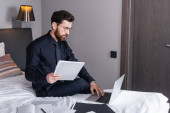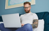 młody wytatuowany freelancer w dżinsach i biały t-shirt za pomocą laptopa w łóżku w pobliżu filiżanki kawy