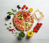 Kobiety biorące plasterki pysznej pizzy warzywnej przy szarym stole, zbliżenie