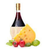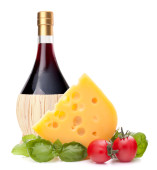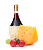 butelka czerwonego wina, ser i pomidor martwa natura