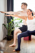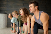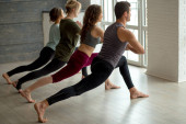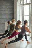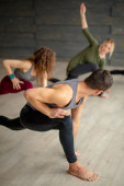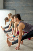 Początkujący jogi ćwiczący na szarej ścianie, uprawiający jogę lub pilates postawy.