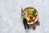 Zdjęcie "Grecka sałatka z fetą i oliwkami na czarnym betonowym tle. Widok z góry." może być wykorzystywane do celów osobistych i komercyjnych zgodnie z warunkami zakupionej licencji Royalty-free. Obraz jest dostępny do pobrania w jakości wysokiej rozdzielczości do 5760x3840.