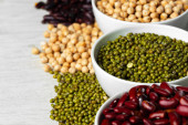 Asortyment fasoli na białym kamiennym stole, zbliżenie.