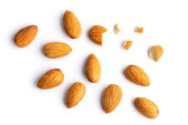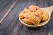 Migdały w drewnianej misce na starym drewnianym stole