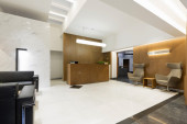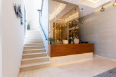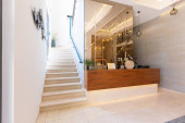 Wnętrze luksusowego lobby hotelowego z marmurową podłogą, recepcja