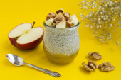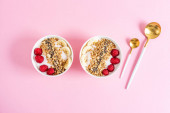 Widok z góry płatków owsianych z fig, malin i jabłek w białej misce w środku różowego tła