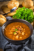 Fasola z sosem pomidorowym, bekonem i kiełbasą w ciemnej misce. Skupienie selektywne.