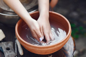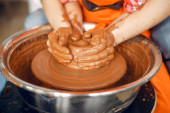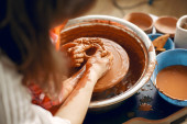 Dziewczyna robi wazę z gliny na maszynie garncarskiej