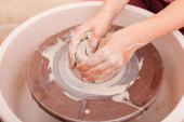 Dziewczyna robi wazę z gliny na maszynie garncarskiej