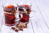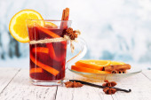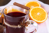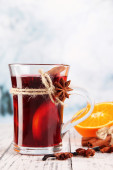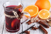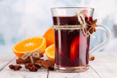 Wino musujące z pomarańczami i przyprawami na stole na jasnym tle