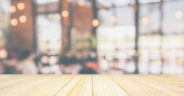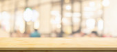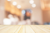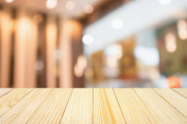 Drewniany blat stołowy z Cafe Wnętrze restauracji z licznikiem bar rozmycie abstrakcyjne tło z bokeh światło