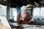 Zdjęcia pięknej, młodej muzułmańskiej biznesmenki w hidżabie, używającej smartfona, trzymającej papiery wyglądające przez okno w biurze..
