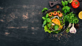 Zdjęcie "Białe drewniane tło kuchni. Warzywa i przyprawy na stole kuchennym. Widok góry. styl rustykalny." może być wykorzystywane do celów osobistych i komercyjnych zgodnie z warunkami zakupionej licencji Royalty-free. Obraz jest dostępny do pobrania w jakości wysokiej rozdzielczości do 5760x3840.