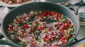warzywa wegańskie gulasz cukinia cebula bakłażan papryka w kadzi na otwartym ogniu na świeżym powietrzu kuchnia