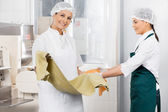 Pracownik piekarz kobieta w białym mundurze gospodarstwa gorący chleb bagietka w rękach w piekarni, tło linii produkcyjnej żywności