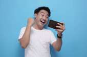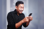 Zdjęcie "Atrakcyjny młody Azjata czytający smsy na czacie przez telefon, uśmiechający się szczęśliwy wyraz śmiechu" może być wykorzystywane do celów osobistych i komercyjnych zgodnie z warunkami zakupionej licencji Royalty-free. Obraz jest dostępny do pobrania w jakości wysokiej rozdzielczości do 5760x3840.
