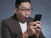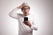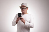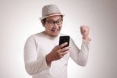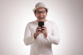 Atrakcyjny młody Azjata czytający smsy na czacie przez telefon, uśmiechający się szczęśliwy wyraz śmiechu