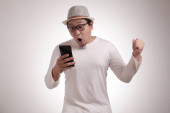 Atrakcyjny młody Azjata czytający smsy na czacie przez telefon, złe wieści, smutny wyraz płaczu