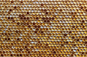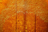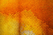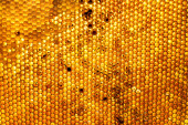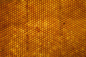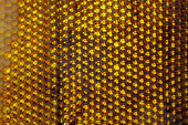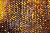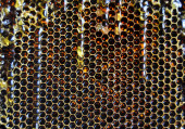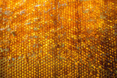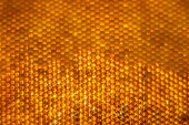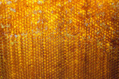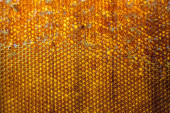 Kropelka miodu z sześciokątnych plastrów miodu wypełnionych złotym nektarem. Letnie kompozycje plastrów miodu składające się z kropli naturalnego miodu, kapią na wosk ramki pszczoły. Kropelka miodu pszczelego w plastrach miodu.
