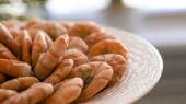 Krewetki tygrysie na dużym białym talerzu, rozmazane tło. Żywność morska.