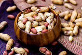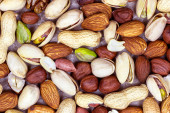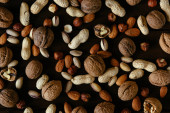 Różne orzechy: migdały, pistacje, orzeszki ziemne, sterta orzechów laskowych na jasnym tle.