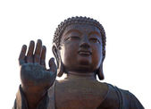 Wielki Budda lub Budda opalenizny Tian na wyspie Lantau, Hong Kong, Chiny. Posąg Buddy Siakjamuni znajduje się w Ngong Ping niedaleko klasztoru Po Lin na Lantau. Blisko widok głowy Buddy i dłoni.