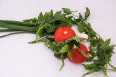 Dwie słodkie papryki, czerwona i żółta cebula, zielone liście i ząbek czosnku leżą na białym stole..