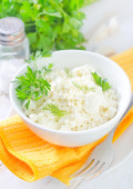 Kuskus z pietruszką w misce. Koncepcja zdrowej żywności. Jedzenie lub zdrowa koncepcja diety. Super jedzenie. Wegetariańskie.